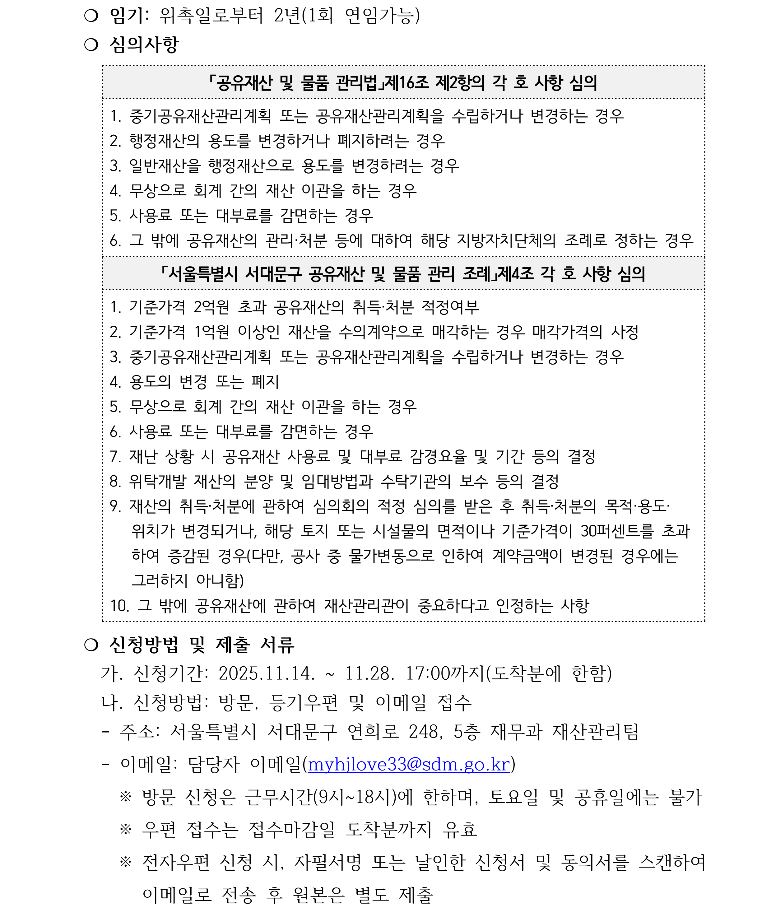 | 제목 | [서대문구] 서울특별시 서대문구 공유재산심의회 위원 공개 모집 알림 |