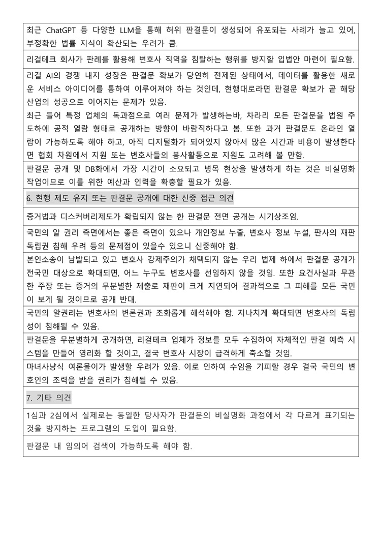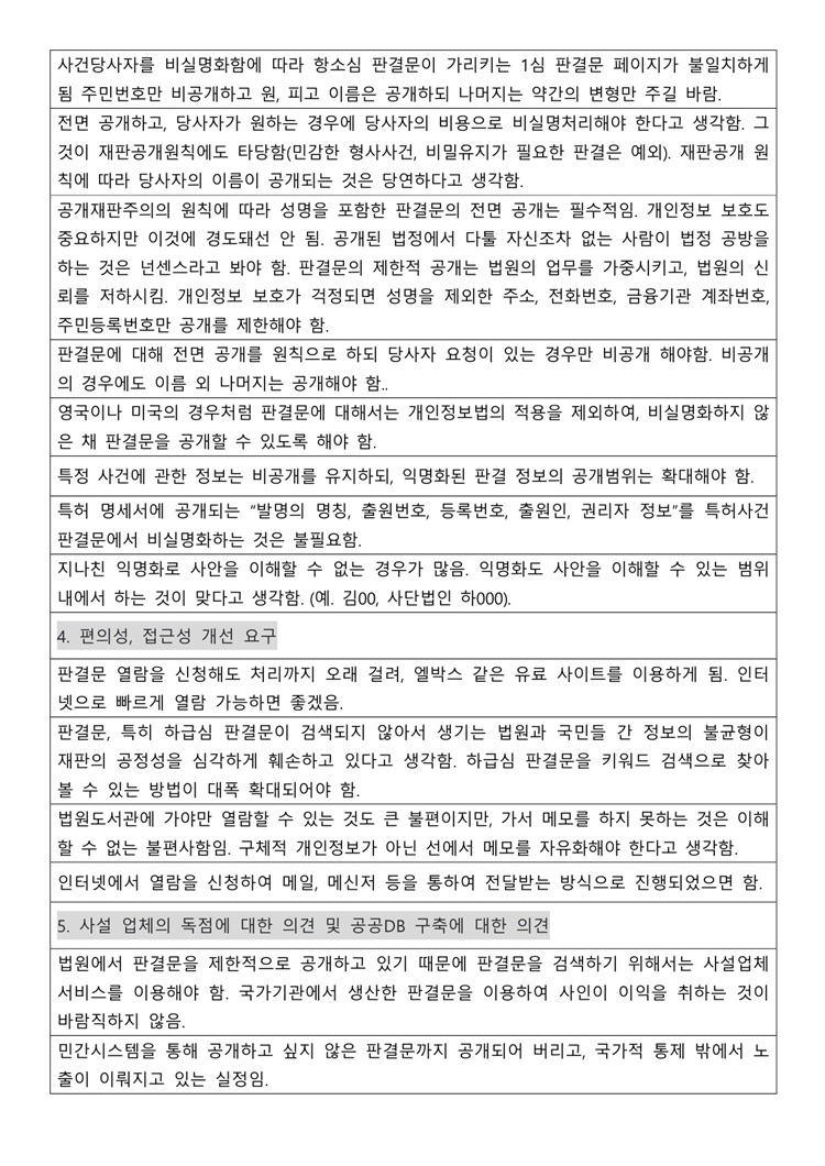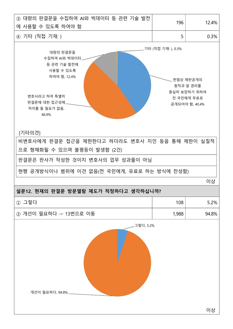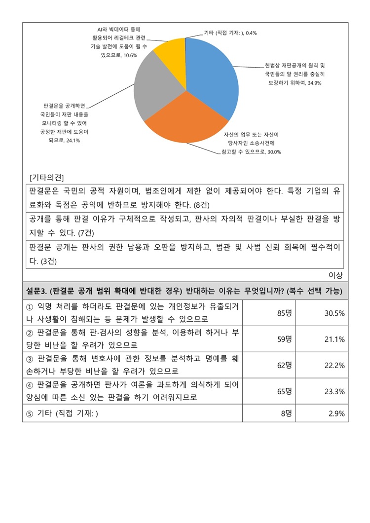 조사 결과, 전체 응답자의 94.2%가 판결문 공개 범위를 현행보다 확대하는 것에 찬성하였으며, 그 이유로는 헌법상 재판공개의 원칙 및 국민의 알 권리 보장(34.9%), 소송사건 참고를 위해(30%), 공정한 재판에 도움(24.1%)이 있었고, AI와 빅데이터 등에 활용되어 리걸테크 관련 기술 발전에 도움(10.6%)이 된다는 의견 역시 확인할 수 있었다.