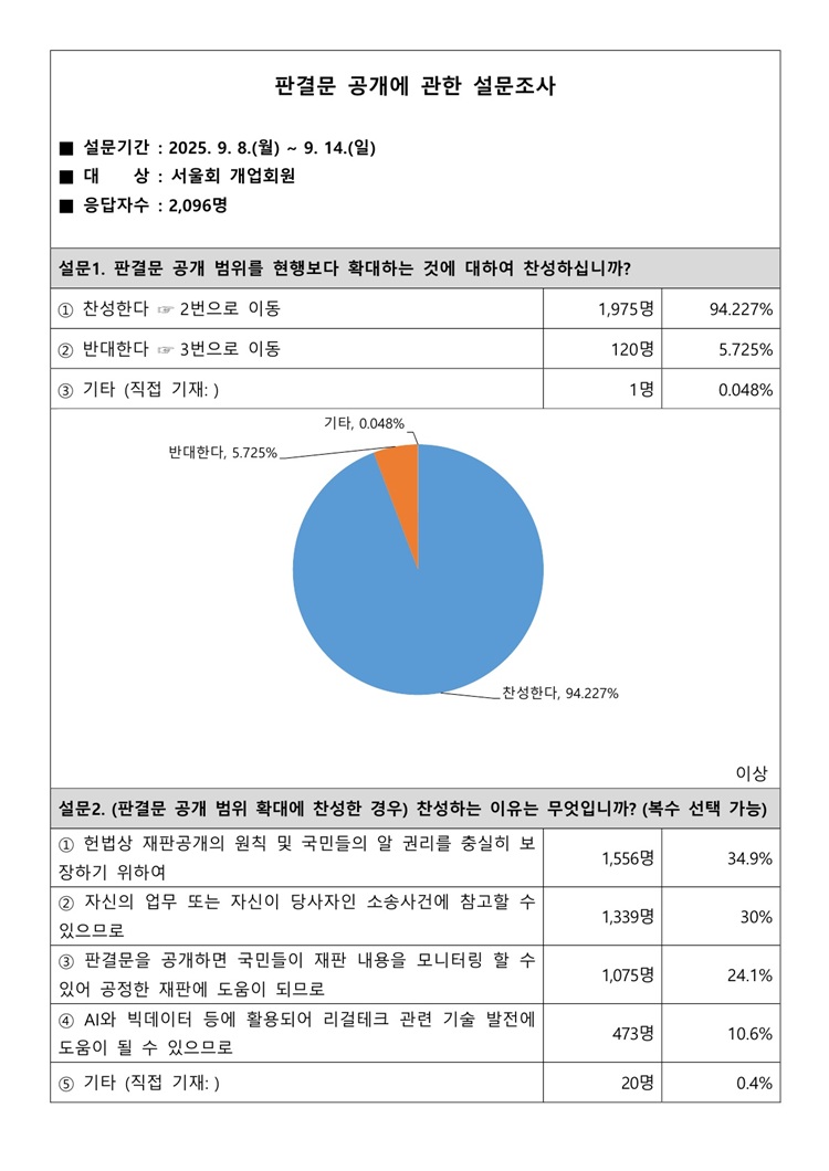 대한변호사협회(협회장 김정욱)는 서울지방변호사회에 의뢰하여 2025년 9월 8일부터 14일까지 7일간 서울회 개업 회원을 대상으로 ‘판결문 공개에 관한 설문조사’를 실시하였다.