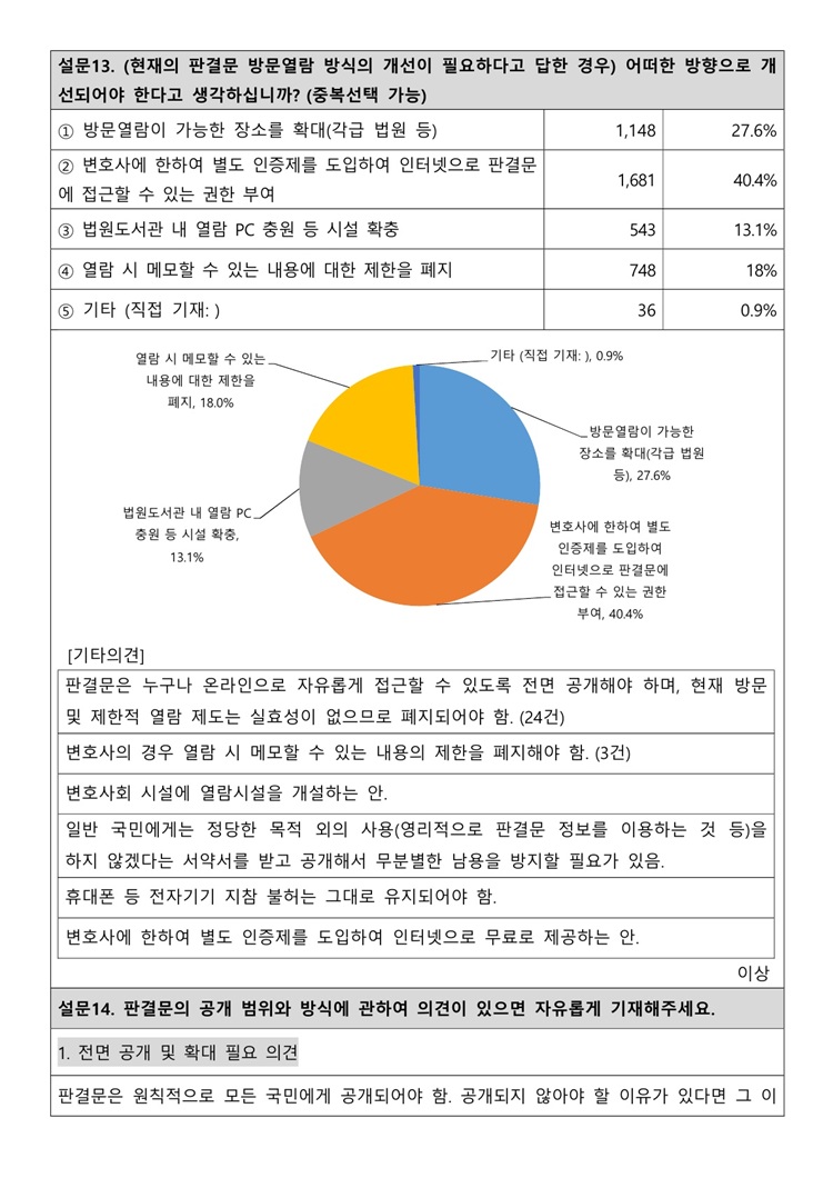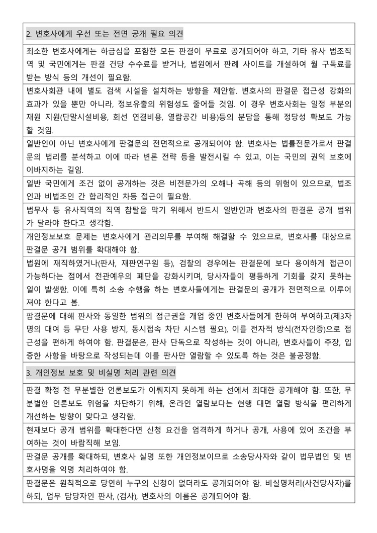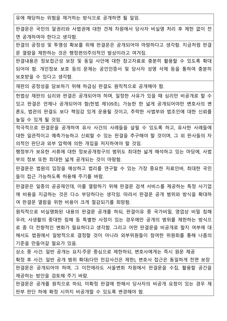 이번 설문조사 결과에 따르면, 변호사들은 판결의 공정성 및 투명성 확보를 위해 판결문 공개 범위 확대 및 공개 시스템의 전반적 수정에 찬성하는 것으로 확인되었다.