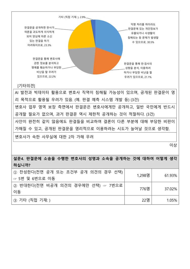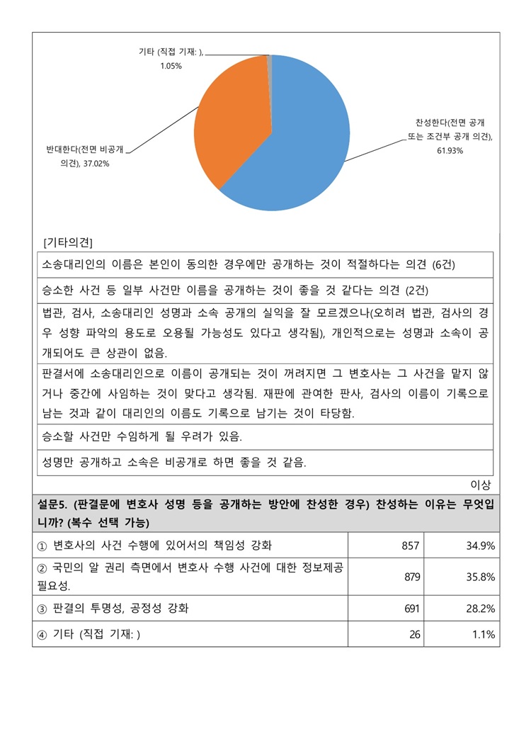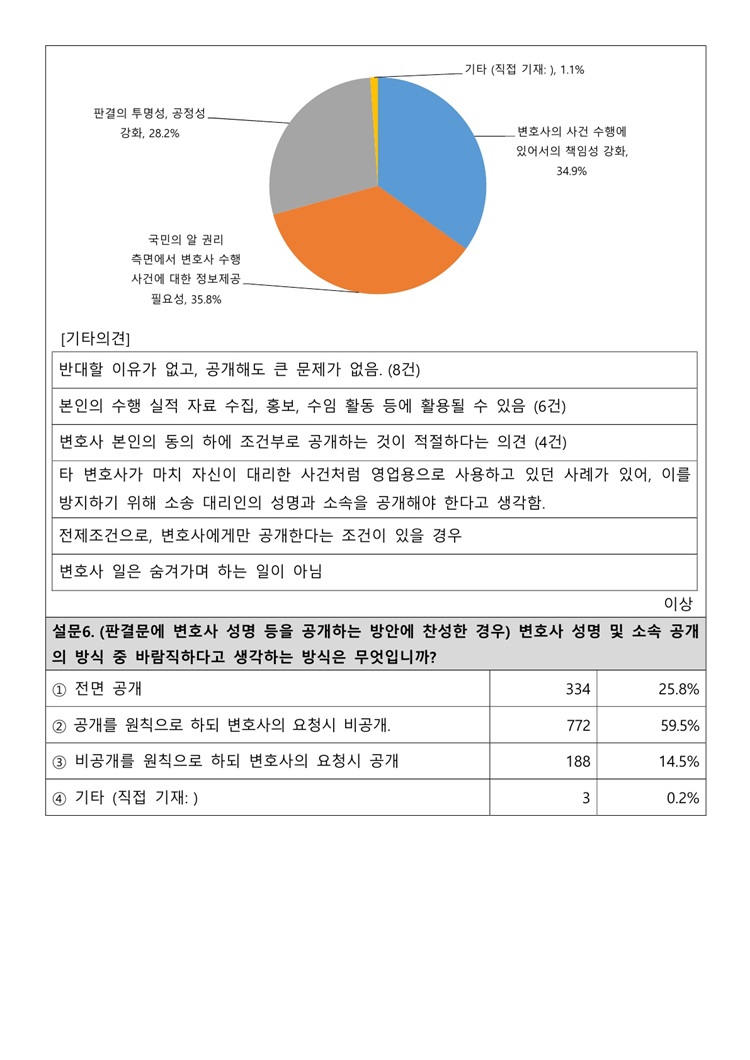 또한, 판결문에 소송을 수행한 변호사의 성명 및 소속을 공개하는 방안에 있어서도 찬성(61.9%)이 반대(37.0%)보다 높게 집계되었는데, 찬성하는 이유로는 변호사의 사건 수행에 있어서의 책임성 강화(34.9%)와 국민의 알 권리 측면에서 정보제공의 필요성(35.8%)이 있다고 답변하였다. 다만, 전면공개보다는 공개를 원칙으로 하되 변호사의 요청 시 비공개로 할 수 있도록 하는 방식을 선호하였다. 그리고 반대하는 이유로는 특정 사건과 관련한 변호사에 대한 낙인효과 발생(39.2%), 변호사 정보를 상업적으로 대량 수집하여 판매하는 등 악용될 가능성이 발생할(32.1%) 수 있다는 의견을 주었다.