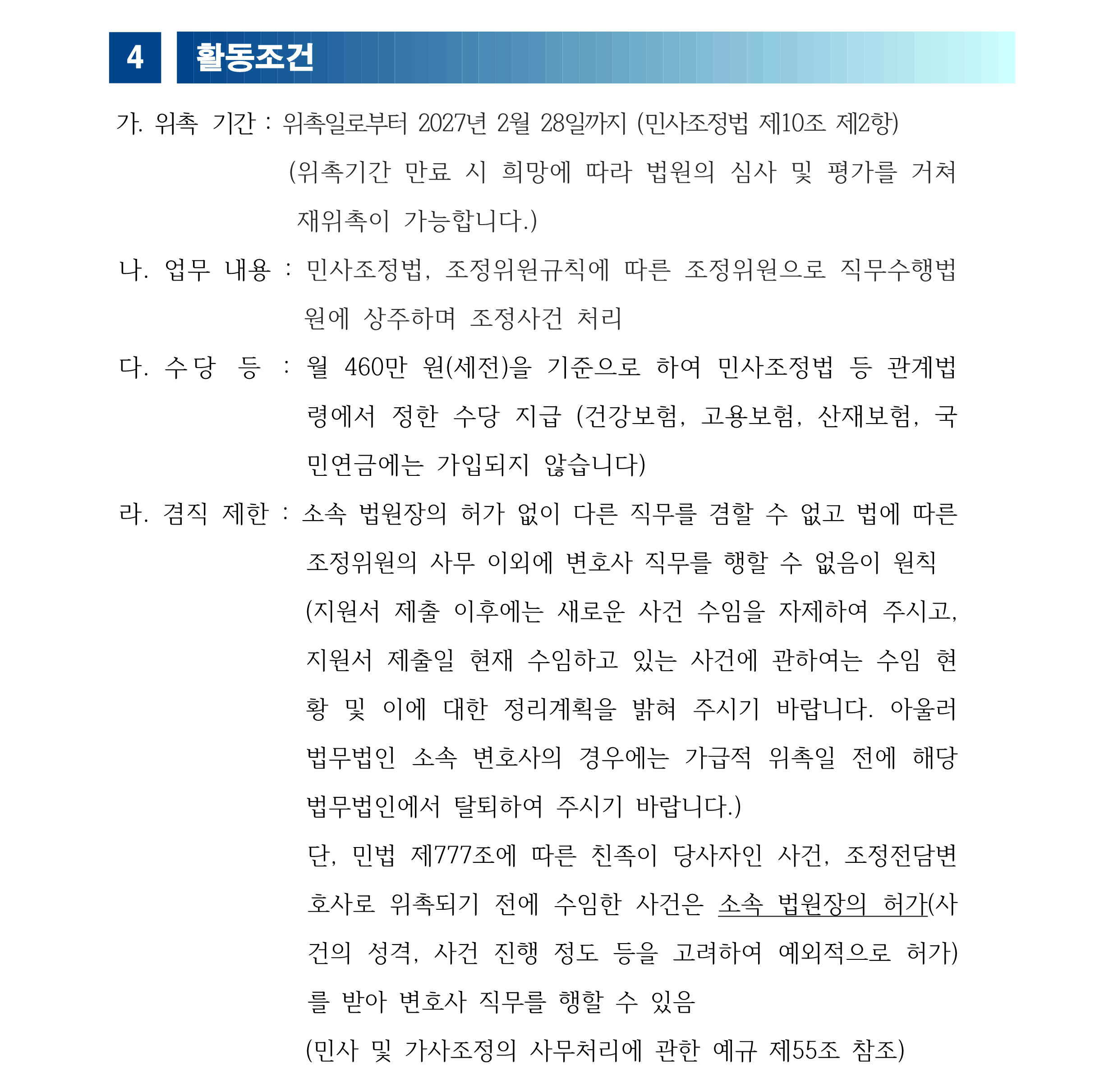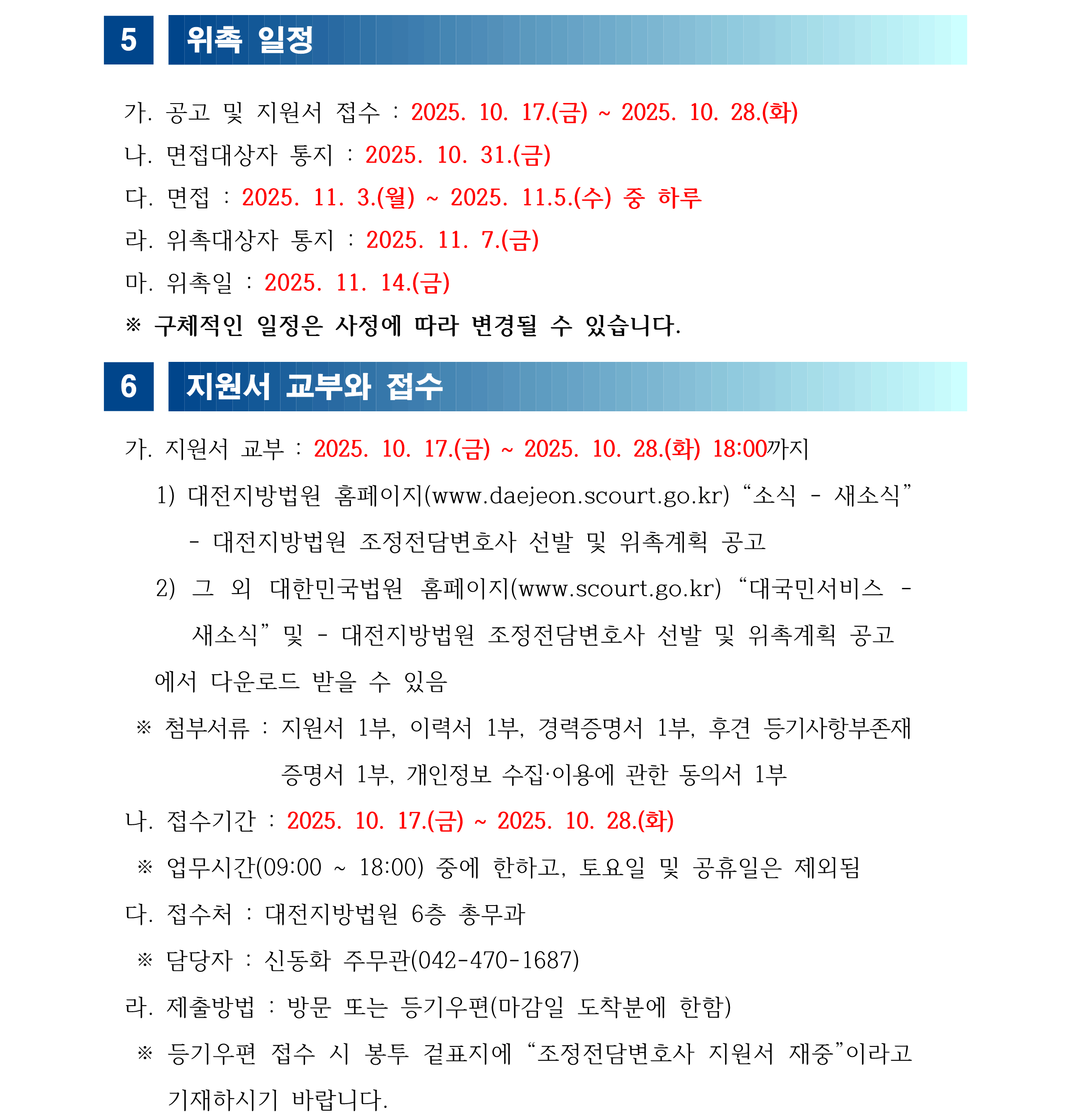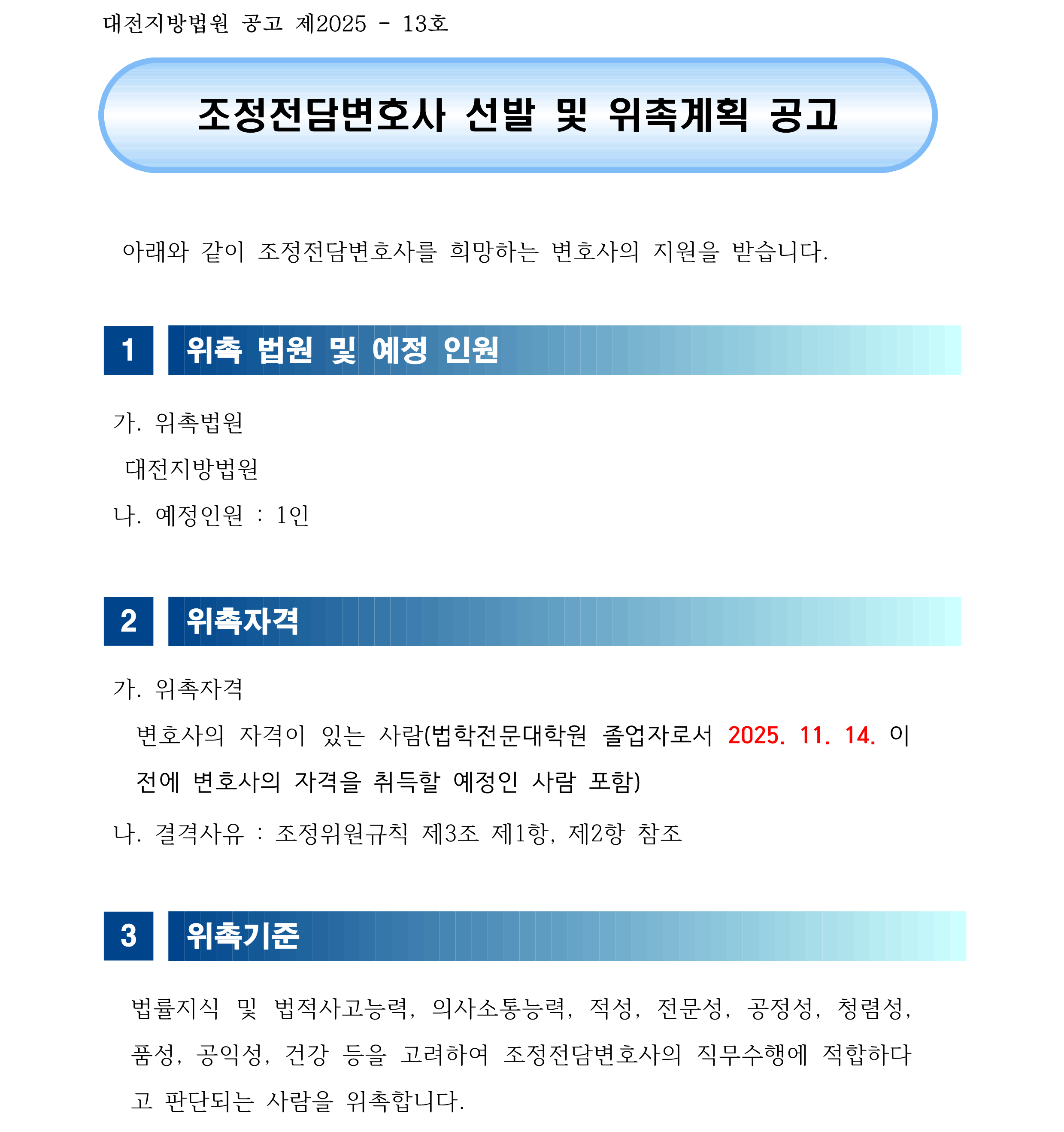 [대전지방법원] 2025년 조정전담변호사 선발 및 위촉계획 공고 안내