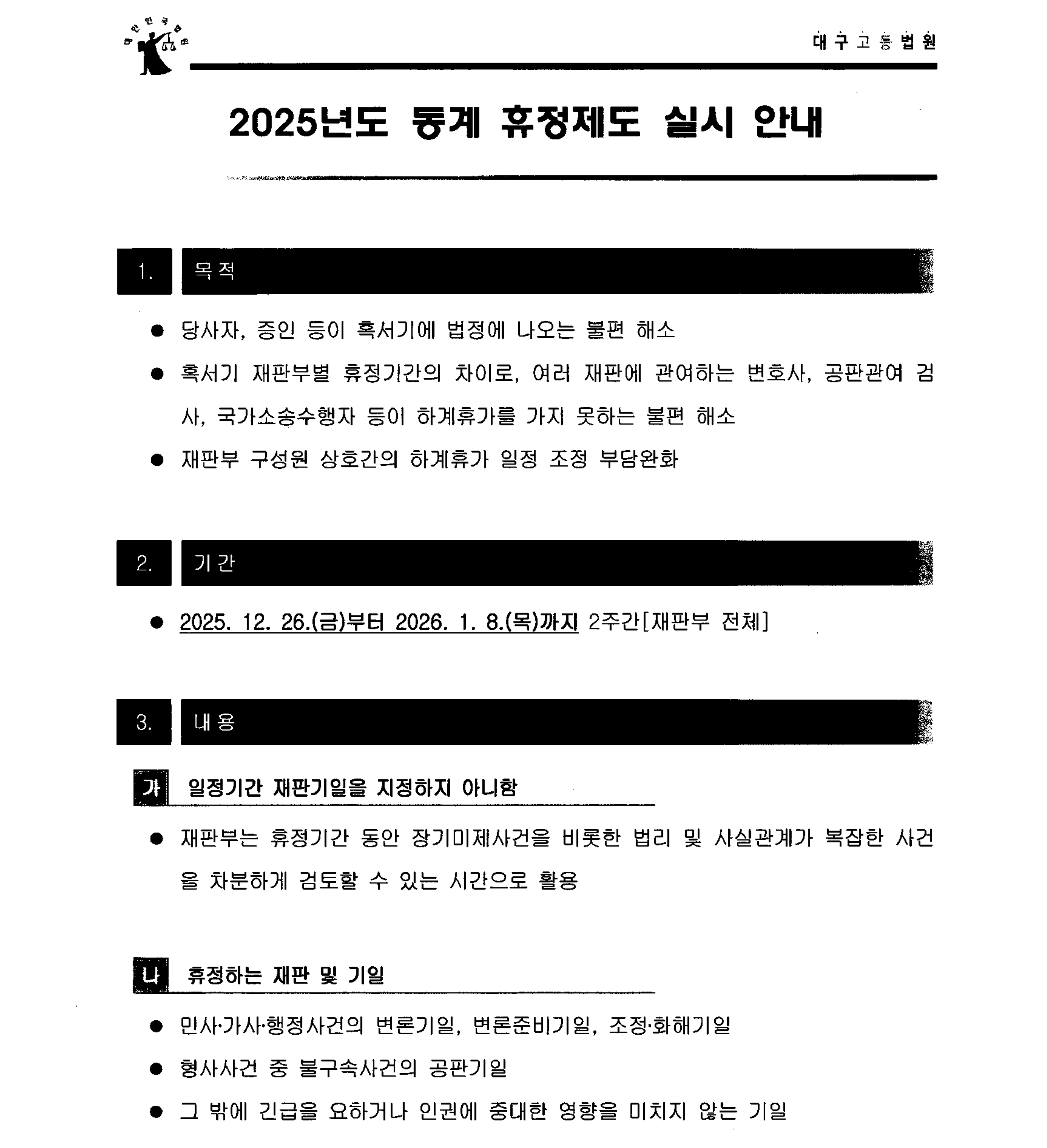 | 제목 | [대구고등법원] 2025년도 대구고등법원 동계 휴정제도 실시 안내 |