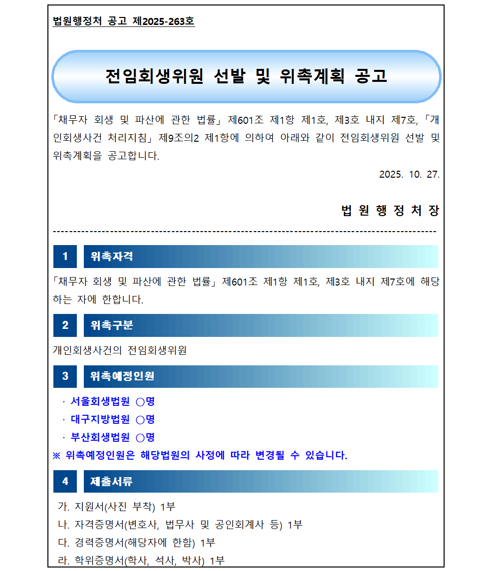 | 제목 | [법원행정처] 서울회생법원, 대구지방법원, 부산회생법원 전임회생위원 선발 공고 안내 |