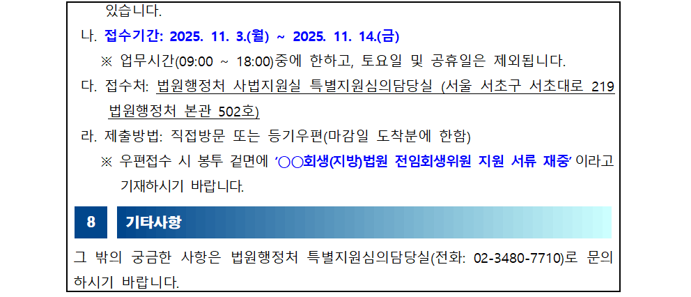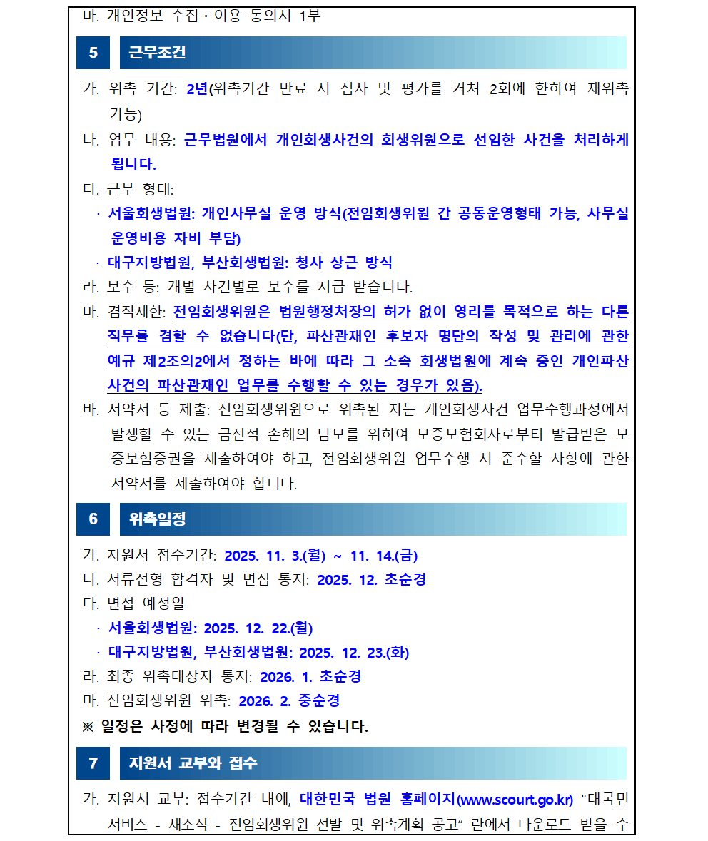 #붙임 : 1. 전임회생위원 선발 및 위촉계획 공고문. 2. 전임회생위원 지원서(양식). 3. 개인정보 수집·이용 동의서(양식). <끝> |