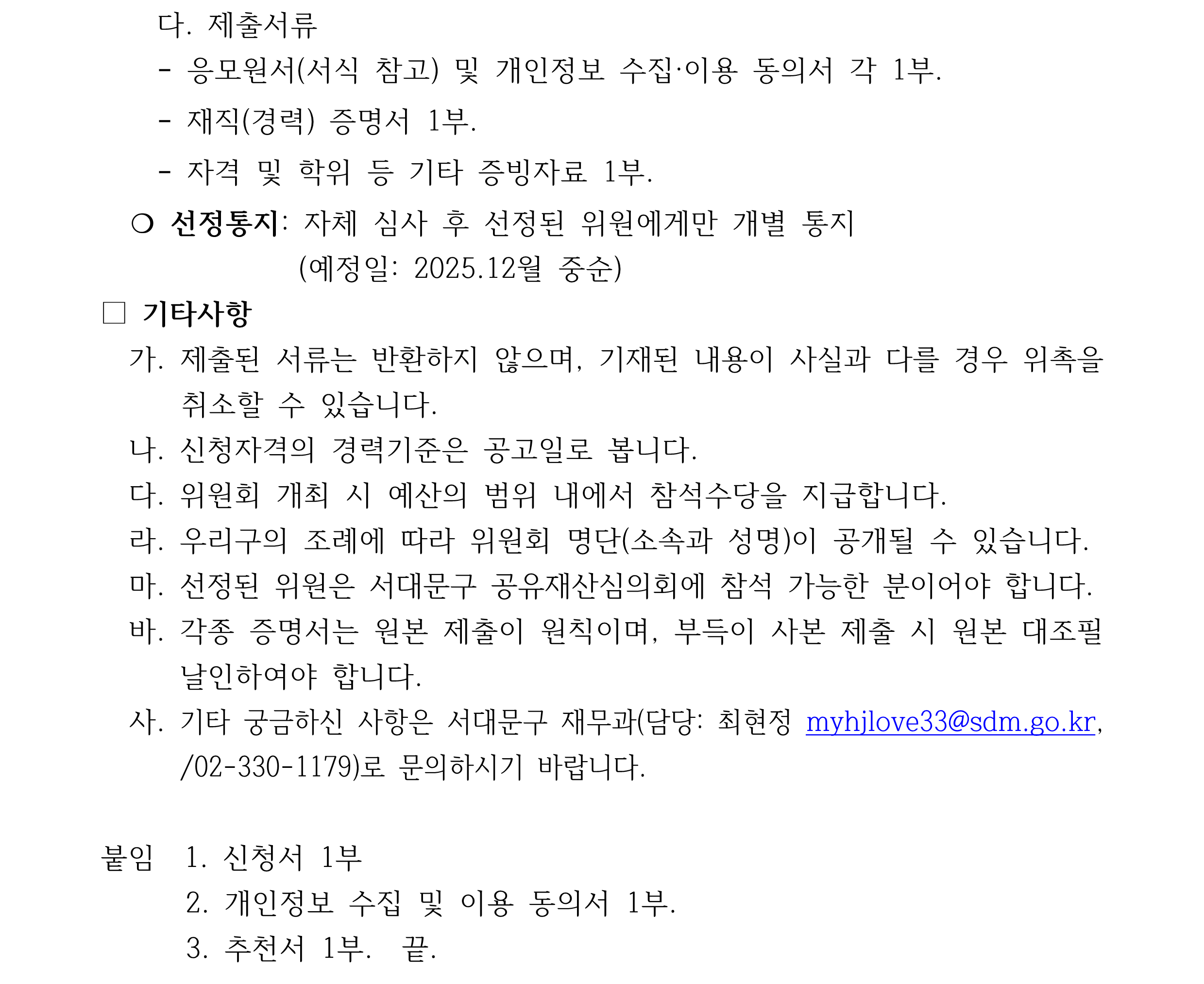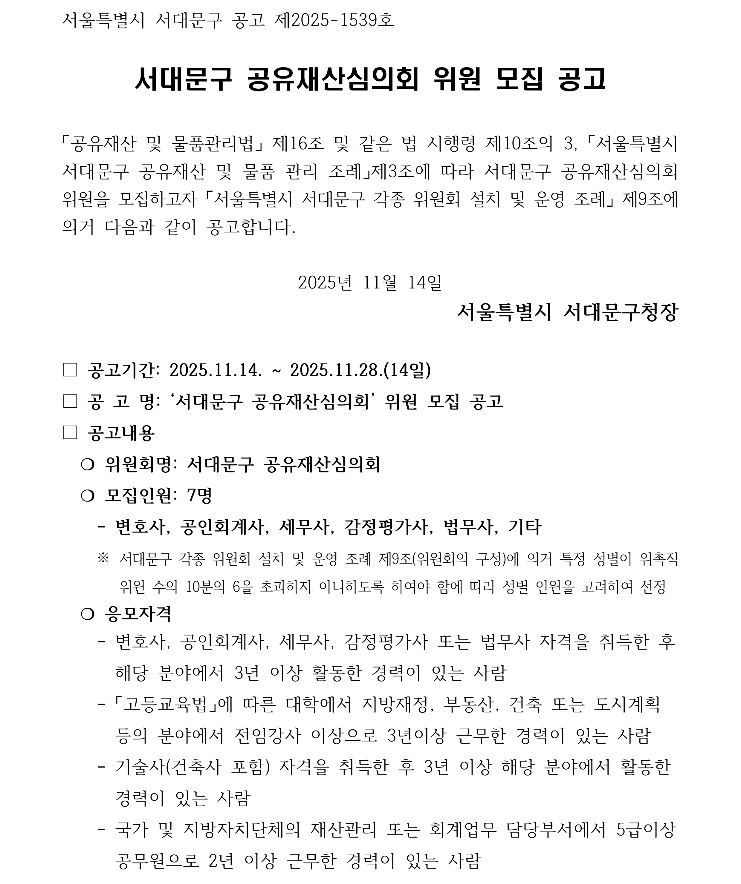 | 제목 | [서대문구] 서울특별시 서대문구 공유재산심의회 위원 공개 모집 알림 |