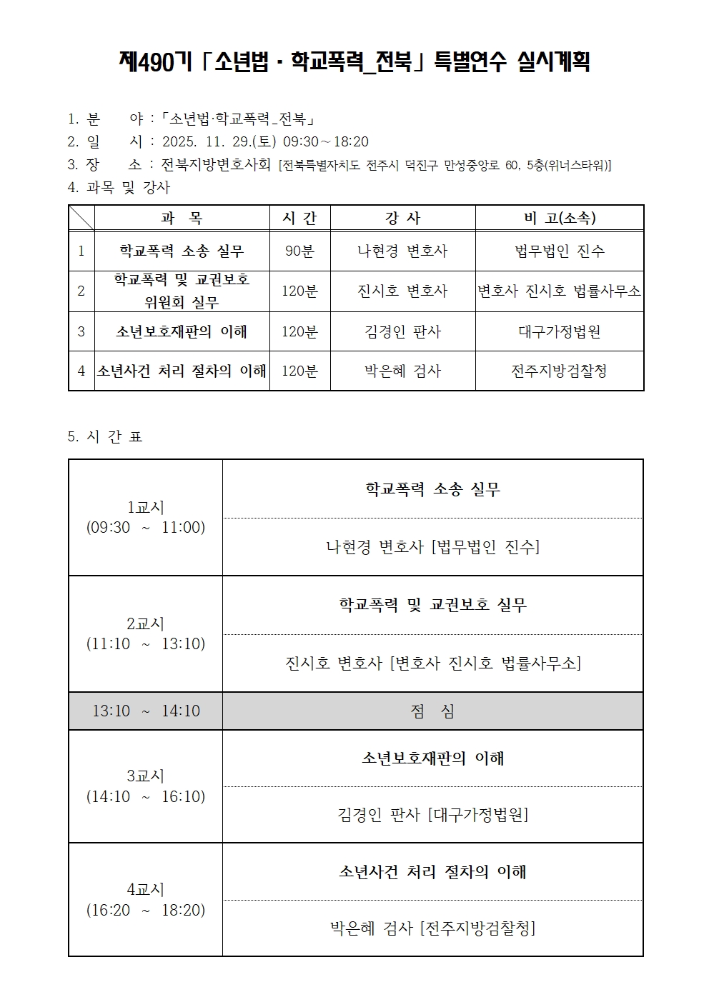 | 제목 | [연수팀] 제490기 「소년법·학교폭력_전북」 특별연수 신청안내 |