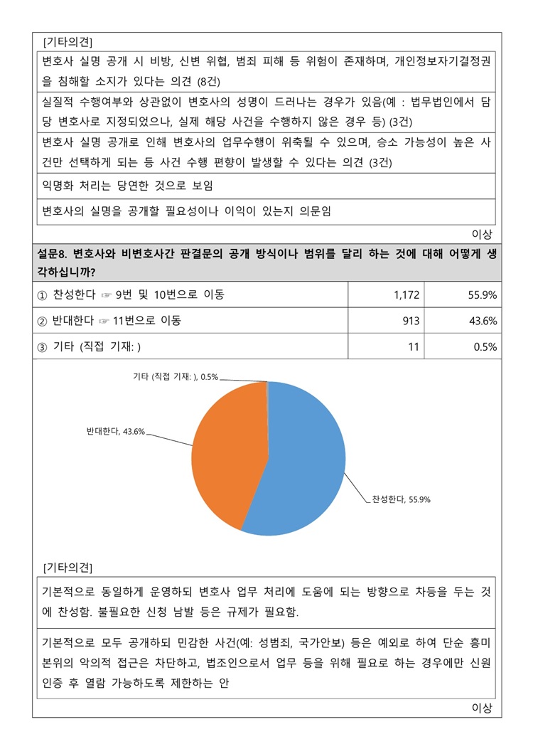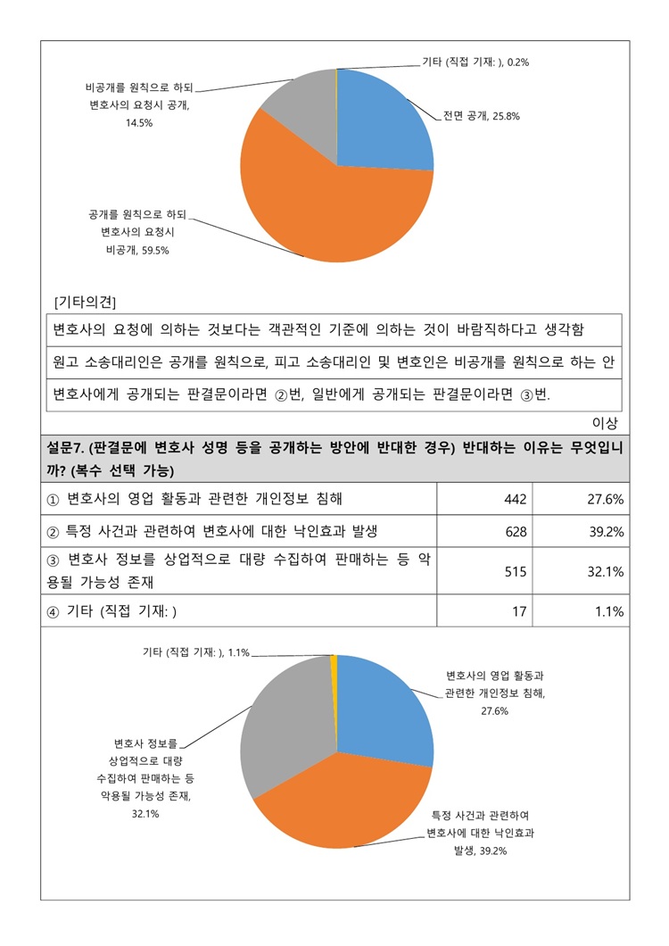 또한, 판결문에 소송을 수행한 변호사의 성명 및 소속을 공개하는 방안에 있어서도 찬성(61.9%)이 반대(37.0%)보다 높게 집계되었는데, 찬성하는 이유로는 변호사의 사건 수행에 있어서의 책임성 강화(34.9%)와 국민의 알 권리 측면에서 정보제공의 필요성(35.8%)이 있다고 답변하였다. 다만, 전면공개보다는 공개를 원칙으로 하되 변호사의 요청 시 비공개로 할 수 있도록 하는 방식을 선호하였다. 그리고 반대하는 이유로는 특정 사건과 관련한 변호사에 대한 낙인효과 발생(39.2%), 변호사 정보를 상업적으로 대량 수집하여 판매하는 등 악용될 가능성이 발생할(32.1%) 수 있다는 의견을 주었다.