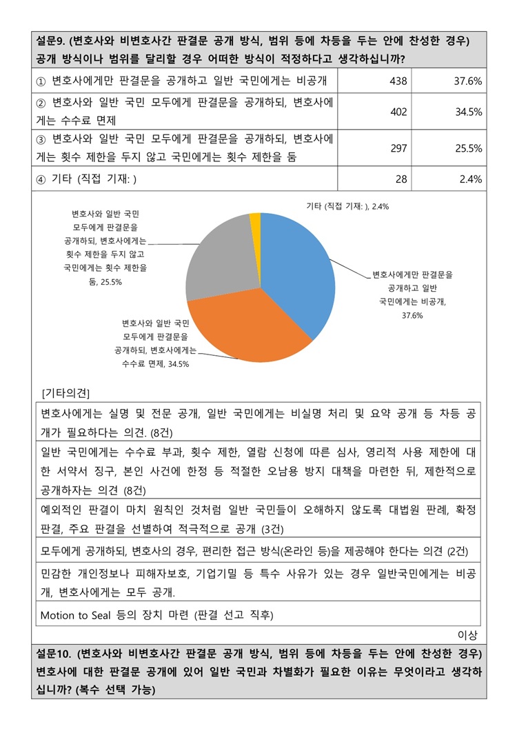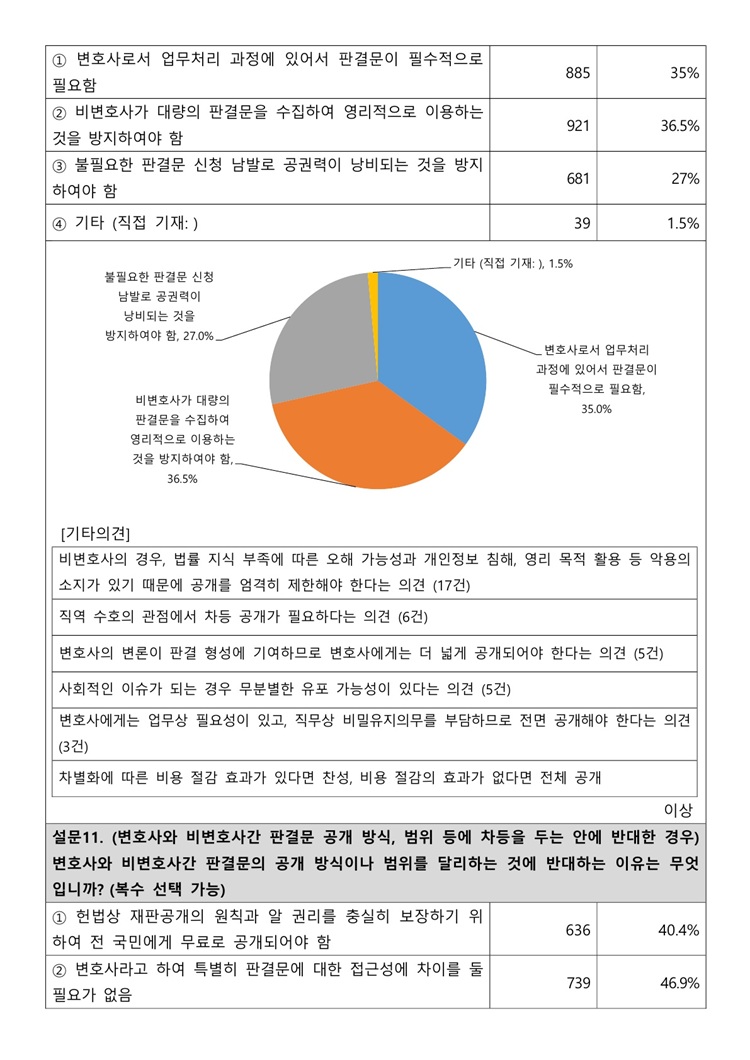 변호사와 비변호사 간 판결문 공개 방식 및 범위를 달리하자는 문항에서는 과반 이상인 55.9%가 찬성했고, 그 이유로는 비변호사의 판결문 수집으로 인한 영리 목적 제재(36.5%)가 가장 높게 나타났다. 또한 공개 방식에 대해서는 변호사에게만 판결문을 공개하고 일반 국민에게는 비공개하는 방안(37.6%)이 가장 많았고, 변호사에게만 수수료를 면제하거나 열람 횟수에 제한을 두지 않는 방안이 뒤를 이었다.